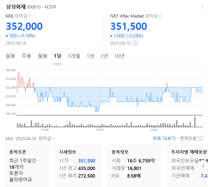 단기 포트폴리오를 구성할 때는 시가 총액과 장중 거래량도 중요합니다. 삼성화재의 시가 총액은 16조6759억 원이며 장중 거래량은 16,801원 을 기록했습니다. 대주주의 정보는 중요하지 않을 수 있으나 장기적인 관점에서는 확인하는 것이 좋습니다.