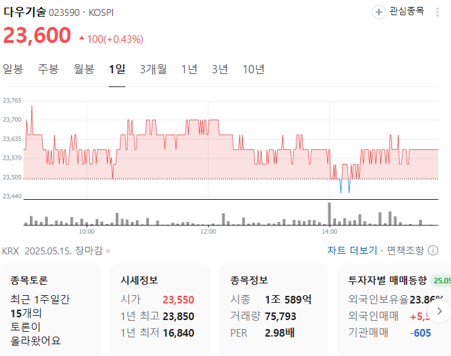 만약 단기 포트폴리오를 구성한다면 시가 총액과 장중 거래량을 살펴봐야 합니다. 다우기술의 시가 총액은 1조589억 원이며 장중 거래량은 81,787원 을 기록했습니다. 대주주의 정보는 크게 중요하지 않지만 장기적으로는 확인하는 것이 좋겠습니다.
