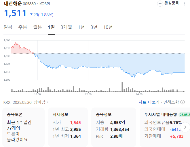 단기 포트폴리오를 구성할 때는 시가 총액과 장중 거래량도 체크해야 합니다. 대한해운의 시가 총액은 4853억 원이며 장중 거래량은 1,028,199원 을 기록했습니다. 대주주의 정보는 중요하지 않을 수도 있으나 장기적으로는 확인이 필요합니다.
