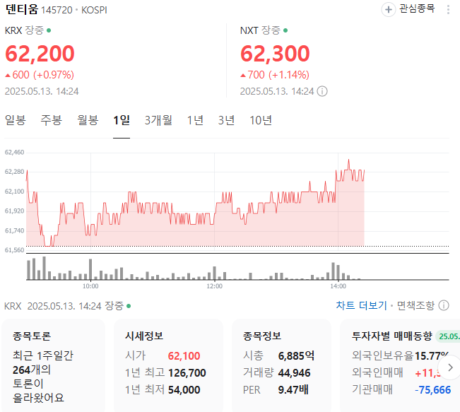 단기 포트폴리오를 구성하려면 시가 총액과 장중 거래량도 확인해야 합니다. 덴티움의 시가 총액은 6885억 원이며 장중 거래량은 134,506원 을 기록했습니다. 대주주의 정보는 중요하지 않을 수 있지만 장기적인 관점에서는 확인하는 것이 좋겠습니다.