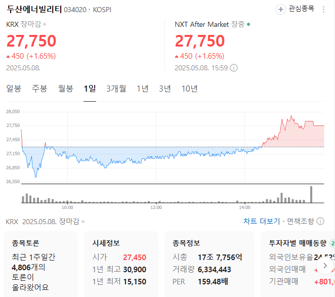 단기 포트폴리오를 구성할 경우 시가 총액과 장중 거래량도 확인해야 합니다. 두산에너빌리티의 시가 총액은 17조7756억 원이며 장중 거래량은 12,312,853원 을 기록했습니다. 대주주의 정보는 크게 중요하지 않을 수도 있지만 장기적인 관점에서는 확인하는 것이 좋겠습니다.