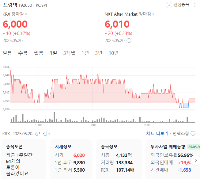 단기 포트폴리오를 구성할 때 시가 총액과 장중 거래량도 주의깊게 봐야 합니다. 드림텍의 시가 총액은 4133억 원이며 장중 거래량은 165,672원 을 기록했습니다. 대주주의 정보는 크게 중요하지 않지만 장기적인 관점에서는 확인하는 것이 좋겠습니다.