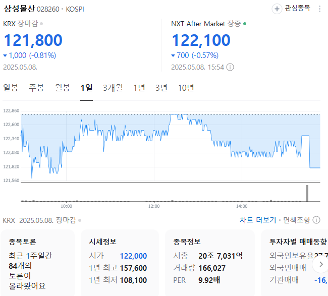시가 총액과 장중 거래량도 단기 포트폴리오를 구성할 때 체크해야 합니다. 삼성물산의 시가 총액은 20조7031억 원이며 장중 거래량은 222,256원 을 기록했습니다. 대주주의 정보는 크게 중요하지 않을 수 있지만 장기적인 관점에서는 확인해보는 것이 좋겠습니다.