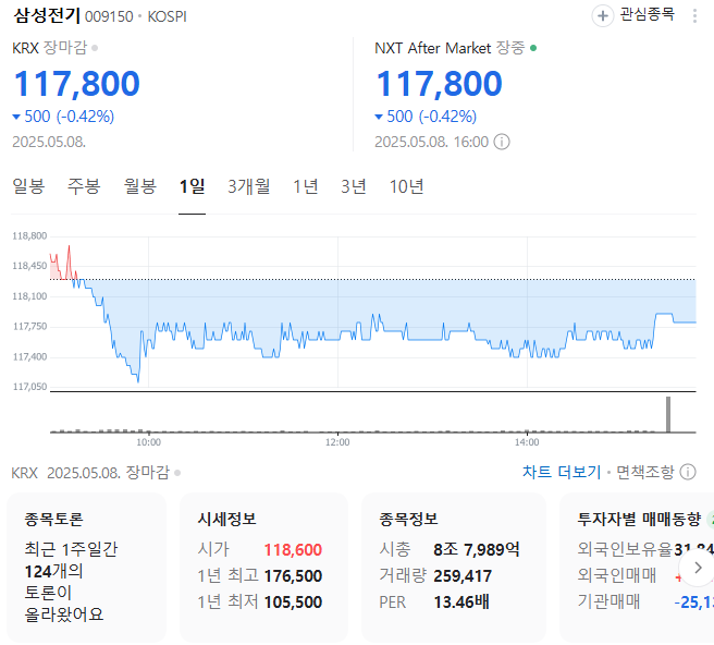 시가 총액과 장중 거래량도 단기 포트폴리오를 구성할 때 살펴봐야 합니다. 삼성전기의 시가 총액은 8조7989억 원이며 장중 거래량은 166,753원 을 기록했습니다. 대주주의 정보는 중요하지 않을 수도 있으나 장기적으로는 확인이 필요합니다.