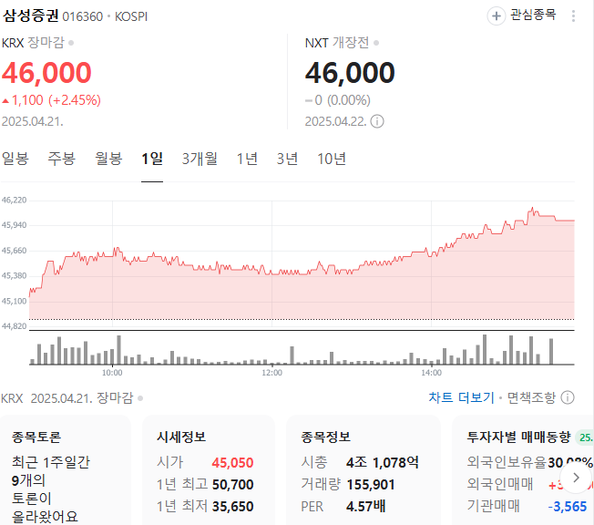 삼성증권의 현재 주가는 44,900원입니다. 전일 대비 -2.18원 이동한 모습입니다. 시가 총액은 4조1078억 원이며 발행 주식은 총 89,300,000주 입니다. 외국인이 보유한 비중은 30.04%입니다. 삼성증권 기업의 영업이익은 억 원을 달성했으며 배당 수익율은 8.08% 입니다.