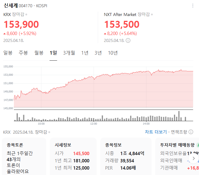 단기 포트폴리오를 구성할 시에는 시가 총액과 장중 거래량도 살펴봐야 합니다. 신세계의 시가 총액은 1조4844억 원이며 장중 거래량은 39,554원 을 기록했습니다. 대주주의 정보는 크게 중요하지 않지만 장기적으로는 확인해보는 것이 좋겠습니다.