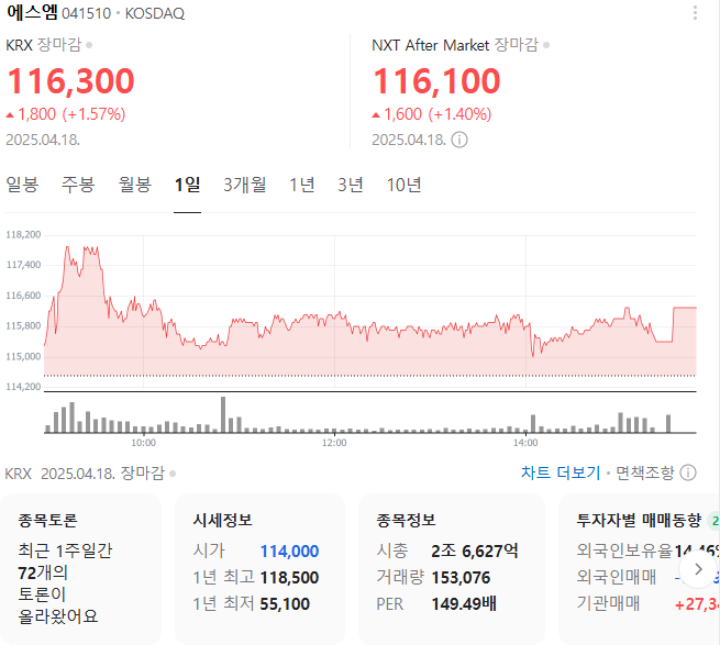 에스엠의 현재 주가는 114,500원입니다. 전일 대비 원 이동한 모습입니다. 시가 총액은 2조6627억 원이며 발행 주식은 총 22,894,690주 입니다. 외국인이 보유한 비중은 14.50%입니다. 에스엠 기업의 영업이익은 억 원을 달성했으며 배당 수익율은 -4.88% 입니다.