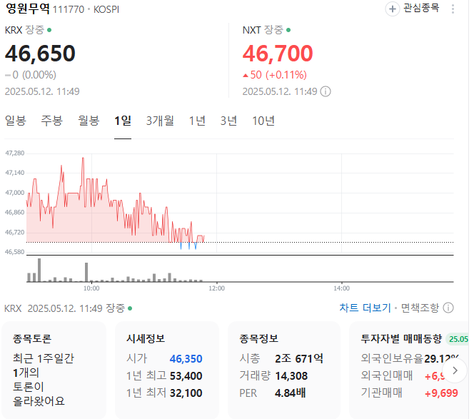 영원무역의 현재 주가는 46,650원입니다. 전일 대비 원 이동한 모습입니다. 시가 총액은 2조693억 원이며 발행 주식은 총 44,311,468주 입니다. 외국인이 보유한 비중은 29.12%입니다. 영원무역 기업의 영업이익은 억 원을 달성했으며 배당 수익율은 3.30% 입니다.