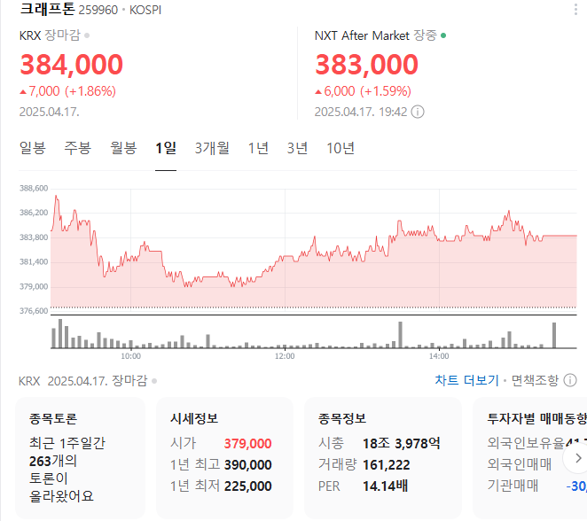 크래프톤의 현재 주가는 377,000원입니다. 전일 대비 원 이동한 모습입니다. 시가 총액은 18조3978억 원이며 발행 주식은 총 47,911,049주 입니다. 외국인이 보유한 비중은 41.66%입니다. 크래프톤 기업의 영업이익은 억 원을 달성했으며 배당 수익율은 % 입니다.