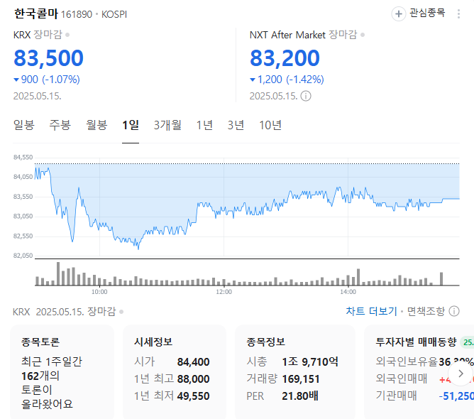 단기 포트폴리오를 구성할 경우 시가 총액과 장중 거래량도 확인해야 합니다. 한국콜마의 시가 총액은 1조9710억 원이며 장중 거래량은 254,481원 을 기록했습니다. 대주주의 정보는 크게 중요하지 않지만 장기적인 관점에서는 확인해보는 것이 좋겠습니다.