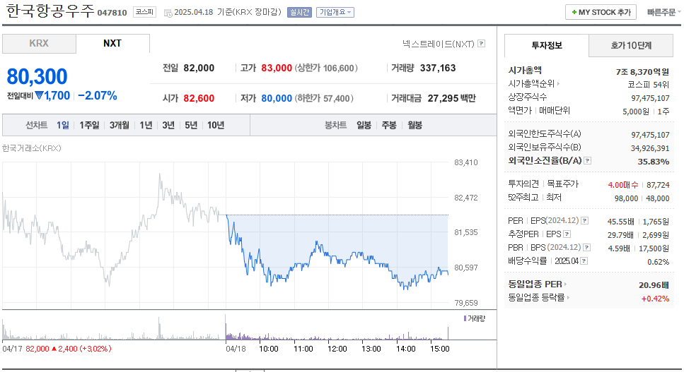 한국항공우주의 현재 주가는 80,400원입니다. 전일 대비 -1,600원 이동한 모습입니다. 시가 총액은 7조8370억 원이며 발행 주식은 총 97,475,107주 입니다. 외국인이 보유한 비중은 35.51%입니다. 한국항공우주 기업의 영업이익은 억 원을 달성했으며 배당 수익율은 13.40% 입니다.