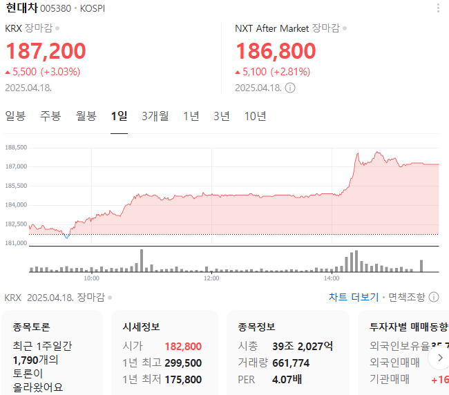 시가 총액과 장중 거래량도 단기 포트폴리오를 구성할 때 살펴봐야 합니다. 현대차의 시가 총액은 39조2027억 원이며 장중 거래량은 664,774원 을 기록했습니다. 대주주의 정보는 크게 중요하지 않을 수도 있으나 장기적으로는 확인해보는 것이 좋겠습니다.