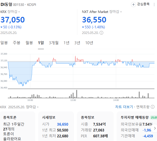 단기 포트폴리오를 구성한다면 시가 총액과 장중 거래량도 살펴봐야 합니다. DI동일의 시가 총액은 7534억 원이며 장중 거래량은 27,433원 을 기록했습니다. 대주주의 정보는 크게 중요하지 않지만 장기적인 관점에서는 확인이 필요합니다.