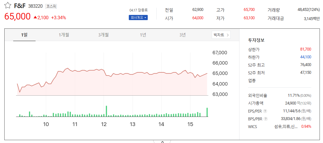 단기 포트폴리오를 구성하려면 시가 총액과 장중 거래량도 확인해야 합니다. F&F의 시가 총액은 2조4900억 원이며 장중 거래량은 38,941원 을 기록했습니다. 대주주의 정보는 중요하지 않을 수 있으나 장기적으로는 확인이 필요합니다.