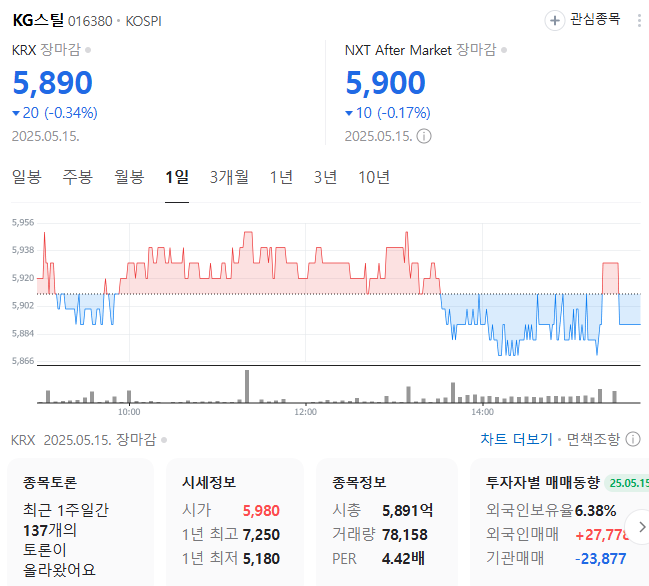 단기 포트폴리오를 구성할 때 시가 총액과 장중 거래량을 꼭 살펴봐야 합니다. KG스틸의 시가 총액은 5891억 원이며 장중 거래량은 61,012원 을 기록했습니다. 대주주의 정보는 중요하지 않을 수 있으나 장기적으로는 확인이 필요합니다.