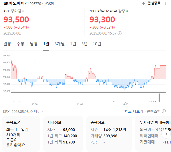 단기 포트폴리오를 구성할 때는 시가 총액과 장중 거래량도 중요합니다. SK이노베이션의 시가 총액은 14조1218억 원이며 장중 거래량은 197,243원 을 기록했습니다. 대주주의 정보는 크게 중요하지 않지만 장기적인 관점에서는 확인해보는 것이 좋습니다.